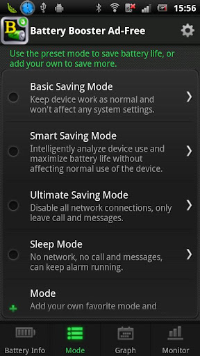 Battery Booster oferece quatro modos de economia de bateria predefinidos para ajudá-lo a economizar mais energia. Esses modos de ver o seu desempenho do sistema e economizar bateria em todas as situações possíveis. Além disso, os modos personalizados são bem-vindas para ser adicionado, se você precisa de técnicas avançadas de economia de bateria.